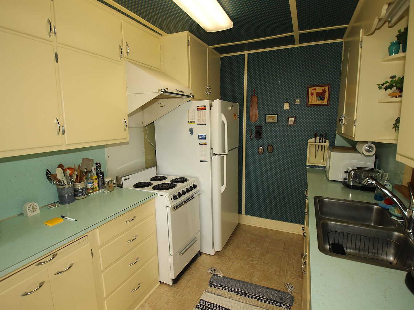 A compact kitchen featuring light yellow cabinetry paired with a textured blue wallpaper, creating a contrast that invokes a vintage feel. The countertops are a muted light blue, complementing the cabinets, while modern appliances like a white refrigerator and stove add functionality. Kitchen utensils and spices are neatly organized, enhancing usability. The space is illuminated by fluorescent lighting, ensuring bright visibility. Decorative items, including framed art and green plants on shelves, add a personal touch. The flooring consists of light-colored tiles, adding warmth and comfort to this cozy culinary space.