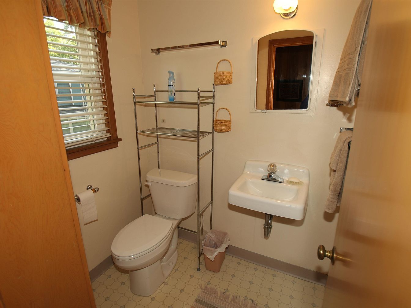 A compact bathroom space featuring essential fixtures. The color palette consists of soft beige walls that create a warm atmosphere. To the right, a white toilet sits beside a sleek, modern pedestal sink fitted with chrome fixtures. Above the sink, a small, round mirror is framed simply. For storage, a thin, metallic shelving unit stands adjacent, showcasing decorative baskets for toiletries. Natural light enters through a window adorned with a muted plaid curtain, contrasting with rich wooden window trim. The floor is tiled with hexagonal patterns, adding a classic touch to this functional yet inviting bathroom layout.