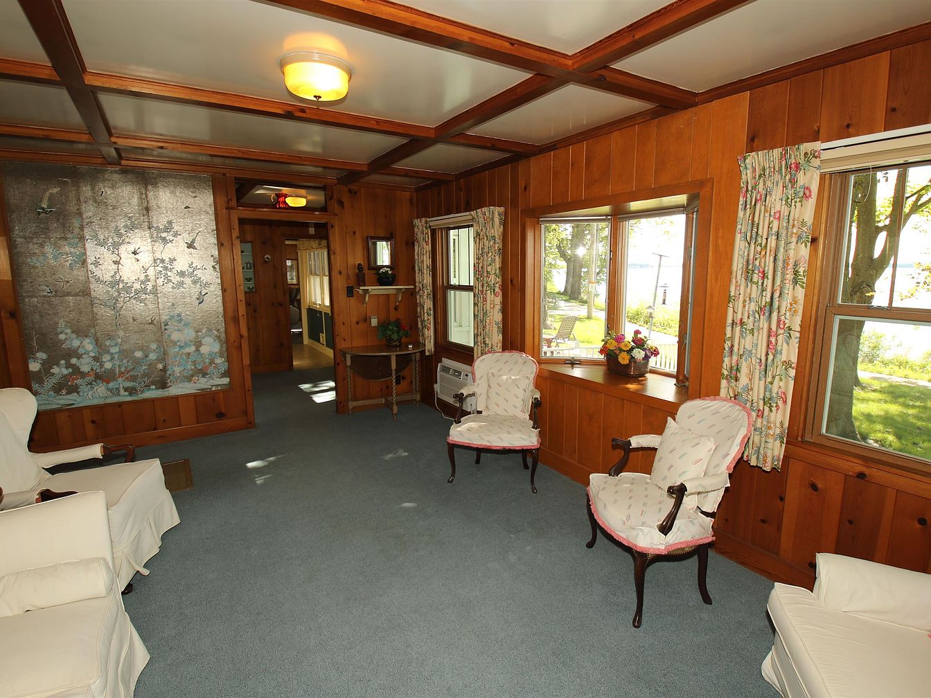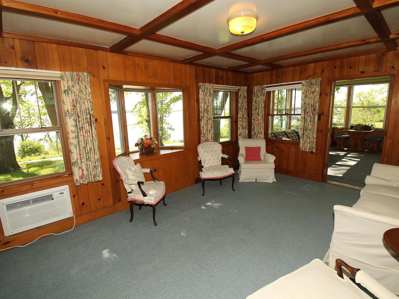 This sunroom features warm wood paneling contrasting with light blue carpet, creating a cozy atmosphere. Large, multi-paned windows frame scenic views of the outdoors, allowing ample natural light to filter in. Floral curtains add a touch of color and softness, enhancing the room’s inviting feel. Two elegant, upholstered chairs with curved wooden legs invite relaxation, while a smaller chair with a pop of pink provides playful contrast. A small window seat offers additional seating, adjacent to a table in an adjoining space. An air conditioning unit is discreetly integrated, ensuring comfort in warm weather.