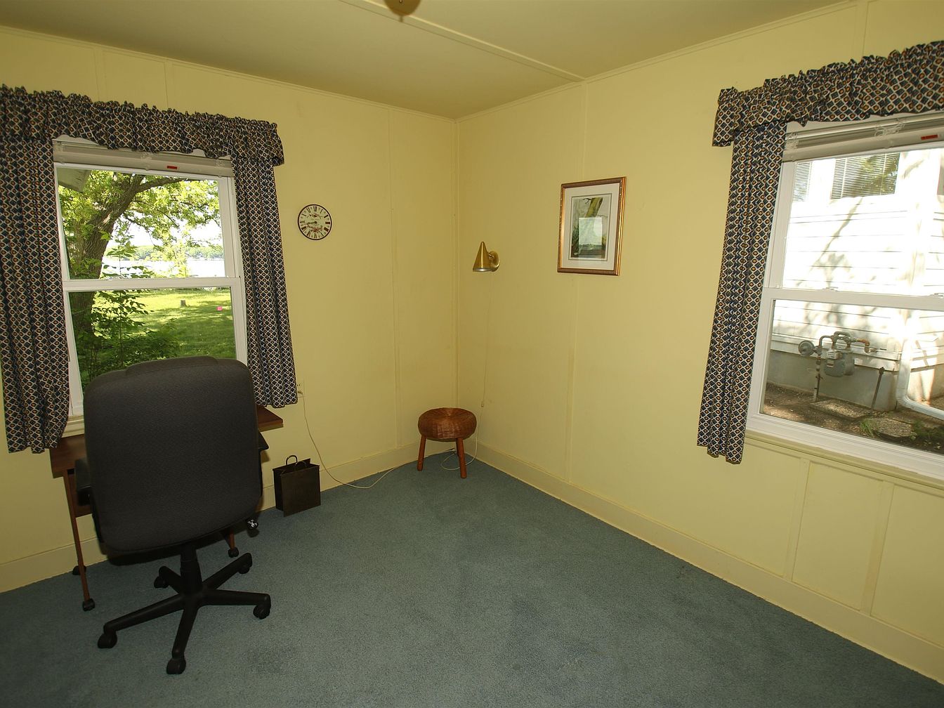 This cozy office space features soft yellow walls, creating a warm ambiance. Natural light floods through two windows adorned with patterned navy curtains. The floor is carpeted in a muted teal, adding a serene touch. A simple wooden desk sits against one wall, accompanied by a comfortable black office chair on wheels. Near the desk, a small round stool provides additional seating. A modern brass wall sconce emits warm light, enhancing the inviting feel. Minimal decorative elements include a framed picture and a small wall clock, creating a functional yet aesthetically pleasing workspace.