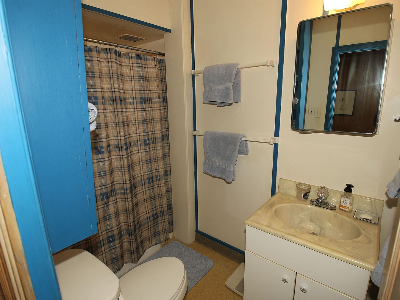 A compact bathroom space featuring beige walls with blue accents, creating a cheerful atmosphere. The shower area is partially enclosed with a plaid curtain in muted tones, enhancing the homey feel. A white vanity with a marbled countertop houses a simple faucet and toiletries. Above it, a rectangular mirror reflects the room’s colors. Towel racks display neatly folded light blue towels, complementing the color scheme. The floor is a light, durable material, contributing to the practicality of the space. Overall, the layout maximizes functionality while maintaining a cozy, inviting ambiance.