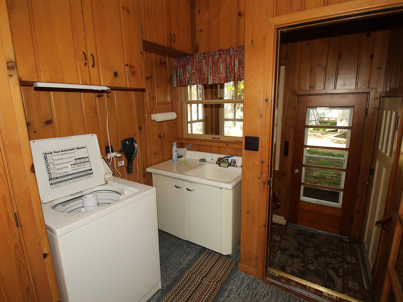 This laundry room features warm, wooden paneling that gives it a cozy feel. The space includes a top-loading washing machine and a utility sink, conveniently placed next to each other. Above, cabinets provide storage and maintain a tidy appearance. A colorful patterned curtain adds a popup of vibrancy against the natural wood. The floor is covered with a textured mat, enhancing both comfort and practicality. A glass-paned door leads to the outside, allowing natural light to brighten the area. This room seamlessly blends utility with a welcoming ambiance, ideal for everyday household tasks.