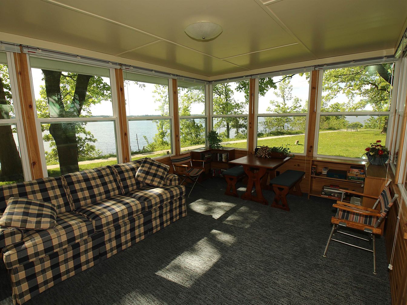 This sunroom features expansive windows that flood the space with natural light while offering picturesque views of the lake and greenery outside. The color palette consists of soft, neutral tones complemented by a classic plaid sofa, which adds a cozy yet rustic charm. A wooden dining table, accompanied by simple stools, provides a functional spot for casual meals or games. The design emphasizes natural materials, with wooden frames and paneling creating a warm, inviting atmosphere. The room’s carpet and furnishings harmonize with the serene outdoor landscape, enhancing its relaxing ambiance.