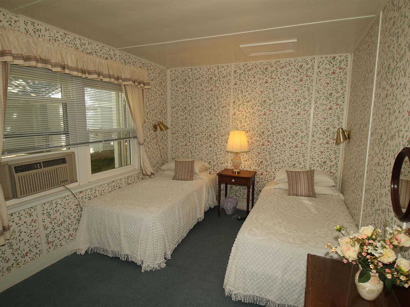 A cozy guest bedroom features two twin beds, each adorned with textured white quilts that drape over the edges. The walls are covered in delicate floral wallpaper, enhancing the vintage charm. A softly lit lamp on a small nightstand provides warmth, accentuated by a stylish gold reading light above each bed. The window, dressed with cream curtains, allows soft natural light to filter in, complemented by a window air conditioner for comfort. A round mirror hangs on one wall, reflecting light and opening up the space. A vase of faux flowers atop a dresser adds a touch of freshness.