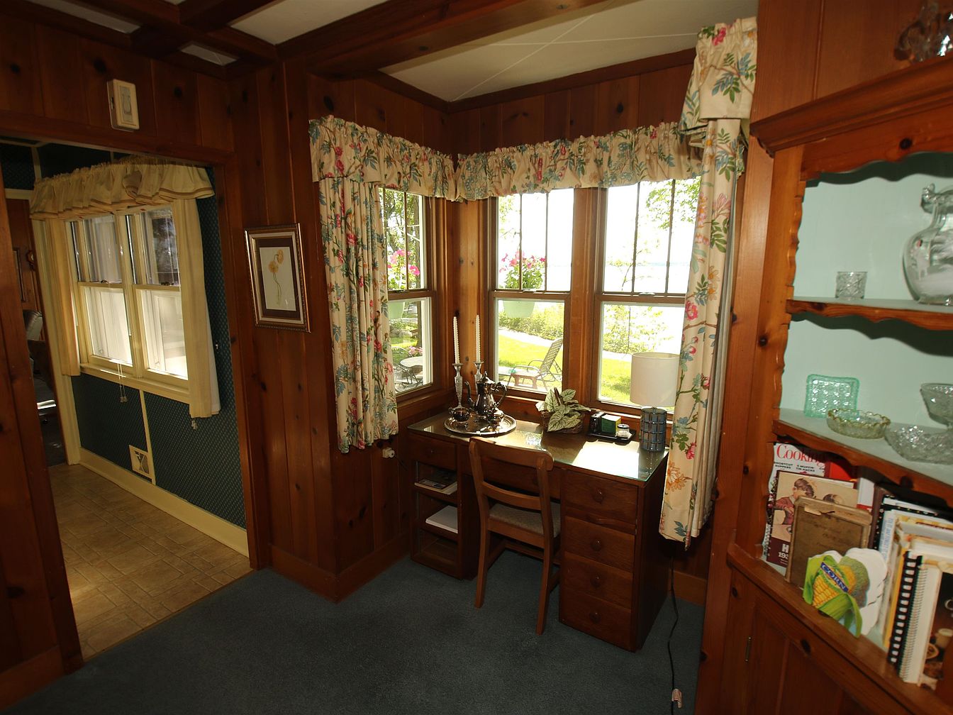 A quaint home office space featuring warm wooden paneling and plush carpeting in soft blue tones. Natural light floods in through large, multi-paned windows adorned with floral curtains, enhancing the inviting atmosphere. A compact wooden desk sits against the wall, equipped with a decorative lamp and various charming accessories. Adjacent shelves showcase an array of vintage glassware and books, adding character to the room. The space is well-organized, appealing with a mix of rustic charm and functionality, punctuated by the tender touch of nature visible from the outside, creating a peaceful work environment.