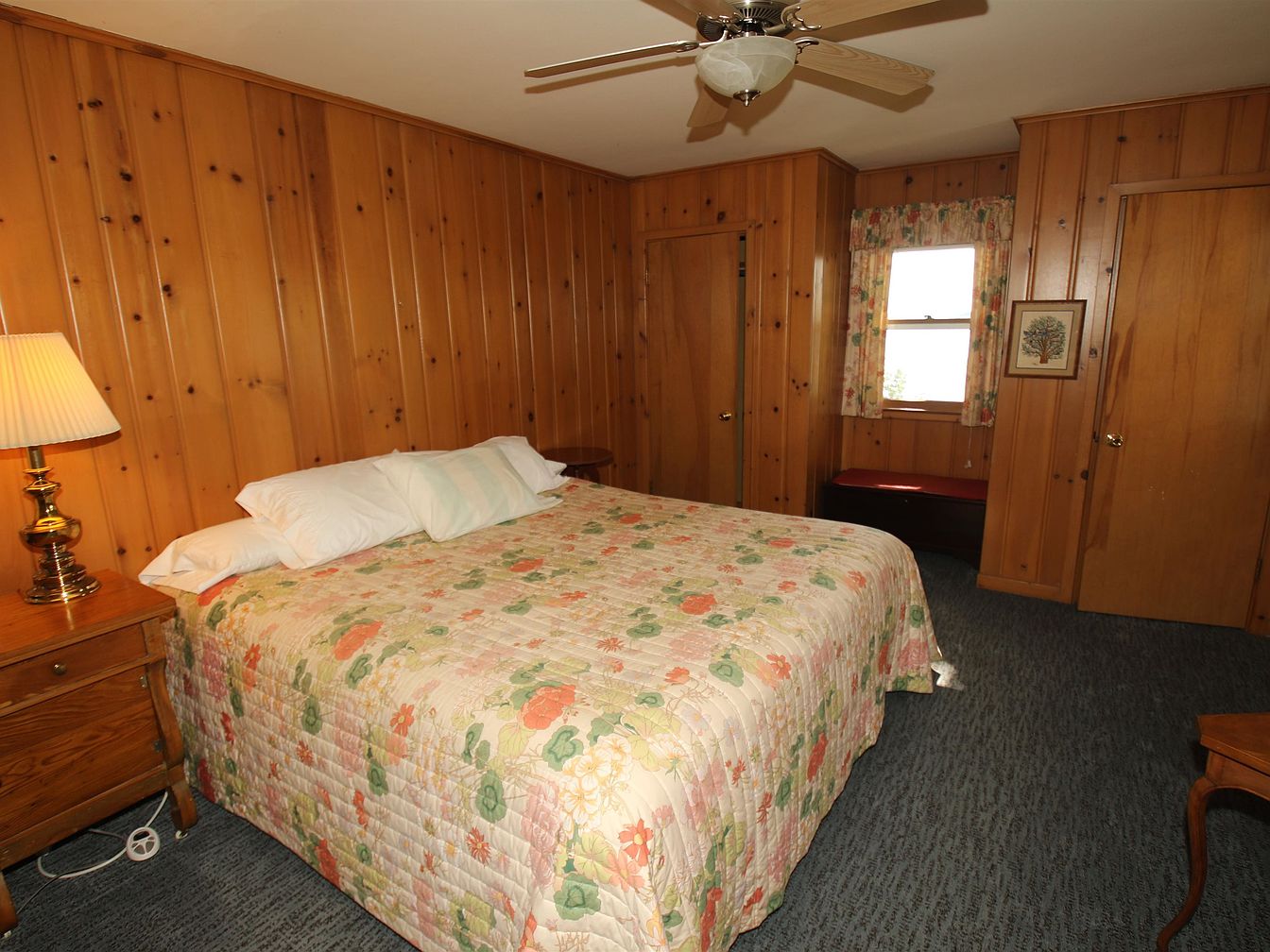 This cozy bedroom features warm wooden paneling, creating an inviting atmosphere. The room centers around a large bed adorned with a floral quilt in pastel shades of pink, green, and orange. A bedside lamp with a classic design provides soft lighting, while a simple nightstand complements the bed. Opposite, a bench beneath the window adds functionality, paired with patterned curtains that echo the quilt’s colors. Two wooden doors lead to additional storage, and a wall-mounted ceiling fan ensures comfort. Overall, the space reflects a nostalgic charm, balancing rustic elements with comfort, suitable for relaxation.