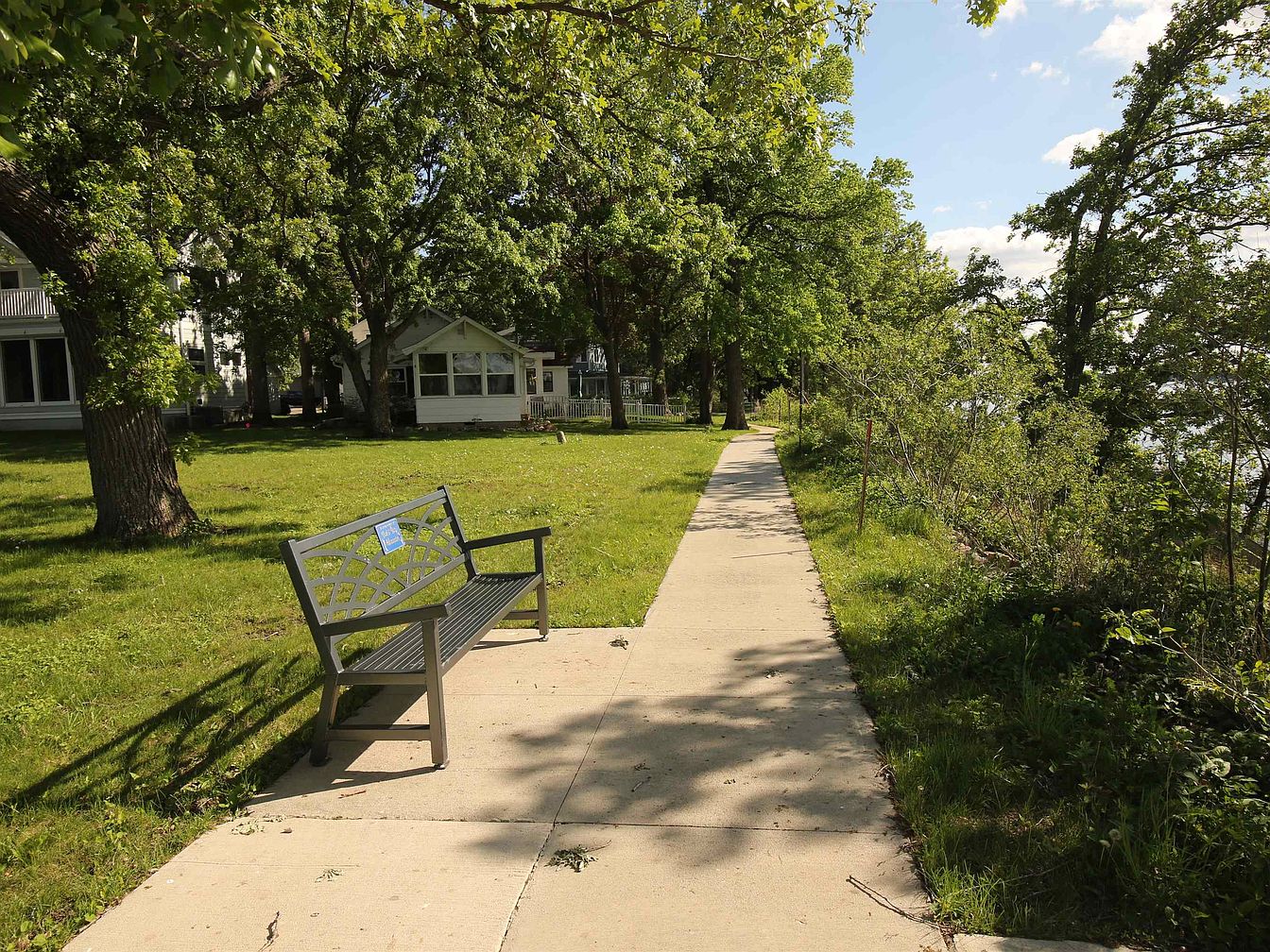 A serene garden path lined with lush greenery extends towards a view of the water. A sturdy gray bench with a decorative backrest sits invitingly on the cement sidewalk, offering a perfect spot for contemplation. Sunlight filters through the leaves of surrounding trees, creating a play of light and shadow on the ground. To the left, a historic house with white siding features large windows, partially obscured by trees. The soft grass contrasts with the paved path, showcasing a harmonious blend of nature and human-made elements, encouraging relaxation and outdoor enjoyment in this quaint residential area.