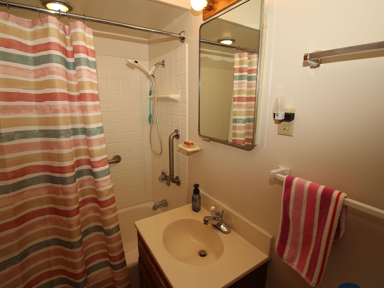 The image showcases a compact bathroom featuring a simple layout with a mixed-use tub and shower setup. A hung striped shower curtain in soft shades of pink, green, and beige provides a warm, inviting atmosphere. The countertop is a pale tan with a single, built-in sink, complemented by wooden cabinetry beneath. A square mirror above the sink reflects overhead lighting, enhancing brightness. Light beige walls encapsulate the space, with white tiled areas adding to the clean aesthetic. A towel rack, holding a striped towel matching the shower curtain, and a small shelf contribute to both functionality and charm.