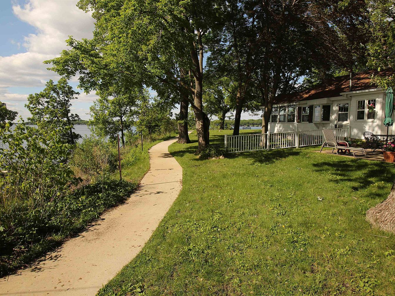 A tranquil garden pathway curves alongside a lush green lawn, bordered by mature trees that provide dappled shade. The pathway, made of smooth concrete, meanders gently towards a quaint house with a white exterior and large windows, inviting natural light indoors. Adorned with a wooden railing, the house features a cozy seating area on the lawn, complete with chairs for relaxation. Bright flower pots add splashes of color to the verdant landscape, enhancing the serene outdoor atmosphere. A calm body of water is visible just beyond the trees, completing this picturesque scene.
