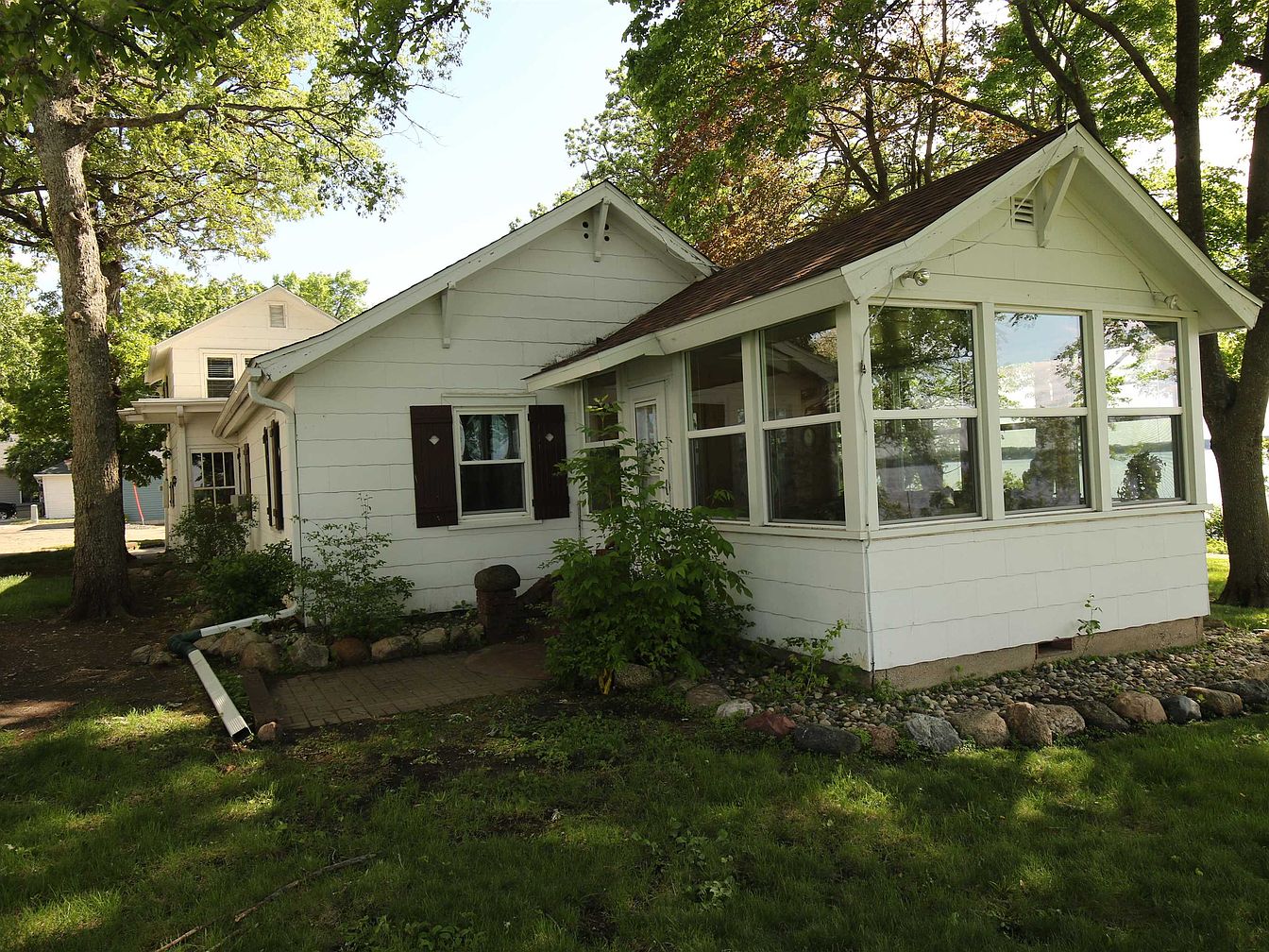 This charming sunroom features large, glass windows that provide abundant natural light and an inviting view of the surrounding greenery. Its simple white wooden siding complements the rustic aesthetic, while the warm-toned gable roof adds character. The foundation is bordered with smooth stones, enhancing the natural look. Tall trees cast dappled sunlight across the lush green lawn, creating a serene atmosphere. The design integrates seamlessly with the rest of the house, showcasing a harmonious balance between indoor and outdoor living. The overall appeal emphasizes a cozy, welcoming space perfect for relaxation.