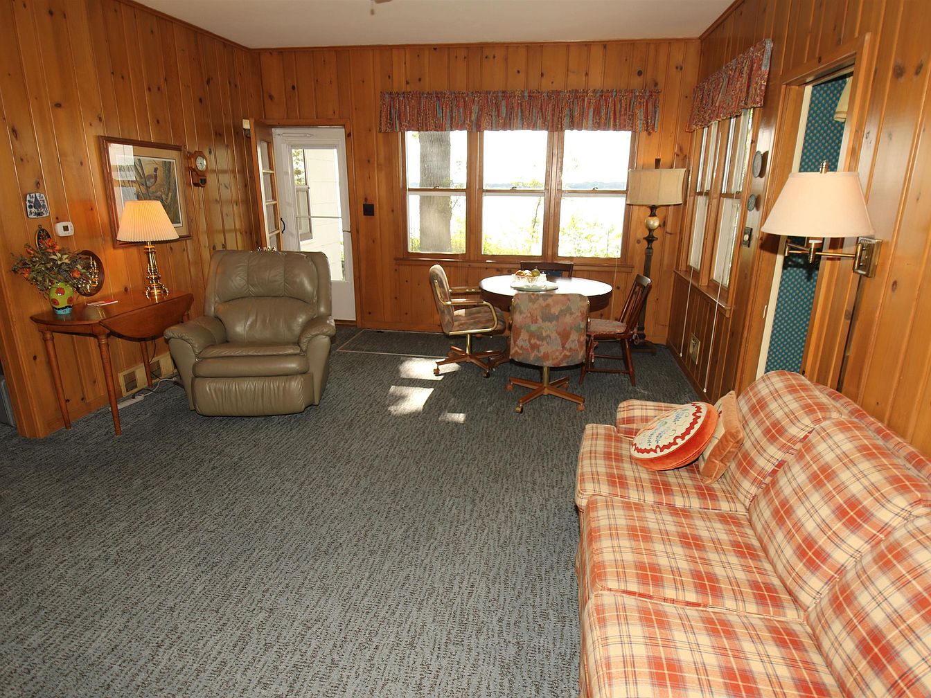 This cozy living room features warm wooden paneling that envelops the space, creating an inviting atmosphere. The flooring is covered in a textured blue carpet, providing contrast against the wood. A plaid sofa, accented with colorful cushions, offers comfortable seating. Nearby, a light-colored recliner complements a small side table adorned with a decorative lamp and floral arrangement. A round dining table with patterned chairs occupies the corner, allowing for casual meals or gatherings. Large windows bring in natural light, framed with patterned valances, enhancing the vintage charm of this historic home.