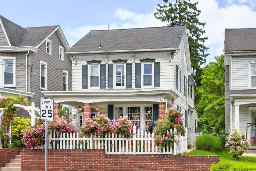 A two-story house painted in classic white with dark green shutters surrounding the front windows. The roof is a traditional gable style covered in gray shingles. A charming front porch is supported by brick columns, blending red brick with the house’s white siding. The front yard is enclosed by a white picket fence atop a low red-brick retaining wall, filled with abundant pink flowering bushes that create a lush, inviting border. Neat greenery lines the walkway and the property edges. The setting conveys a warm, historic American neighborhood vibe with well-maintained curb appeal.