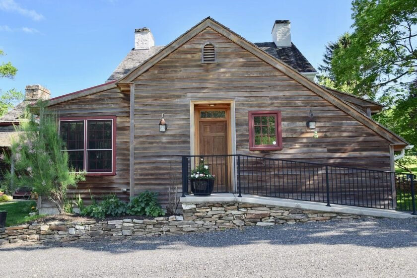 A peaceful rural scene with a cluster of historic buildings set amid open grassy land and surrounded by a split-rail wooden fence. The structures present rustic charm with their weathered wood siding and traditional white paint. One building closest to the foreground displays natural wooden plank siding with a steeply pitched roof and an entrance illuminated by barn-style lights. Behind it, a larger white house with several chimneys and simple window designs rises, shaded by large deciduous trees with bare branches. The backdrop includes a forested hillside under a clear blue sky, evoking tranquil country living.