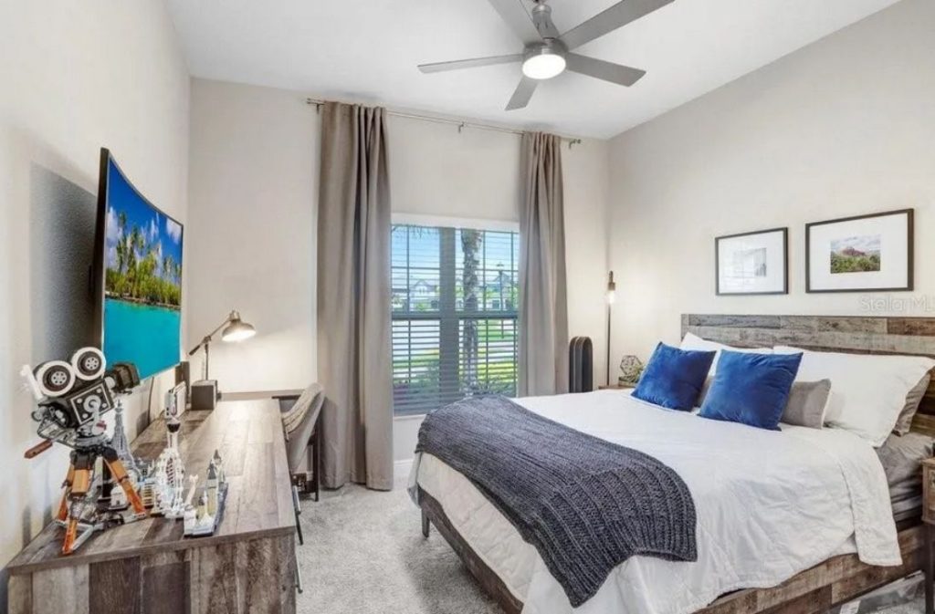 This spacious master bedroom exudes calm and comfort, featuring a plush bed adorned with soft bedding and vibrant green pillows. The neutral tones of the room, paired with light streaming through the large windows, create a relaxing atmosphere. The stylish dresser and mounted TV add convenience and elegance, while the modern ceiling fan ensures a comfortable temperature year-round. The clean lines and tasteful decor make this room an ideal sanctuary for rest and relaxation.