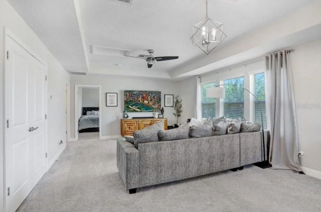 This inviting master suite seamlessly blends comfort and style with its airy layout and cozy sitting area. The plush gray sofa serves as the perfect spot for relaxation, framed by natural light pouring in from large windows with soft drapes. A striking piece of art enhances the room’s aesthetic, while a geometric chandelier adds a touch of elegance. The light, neutral tones throughout create a tranquil atmosphere, while the thoughtful furniture layout makes the space feel both spacious and intimate.