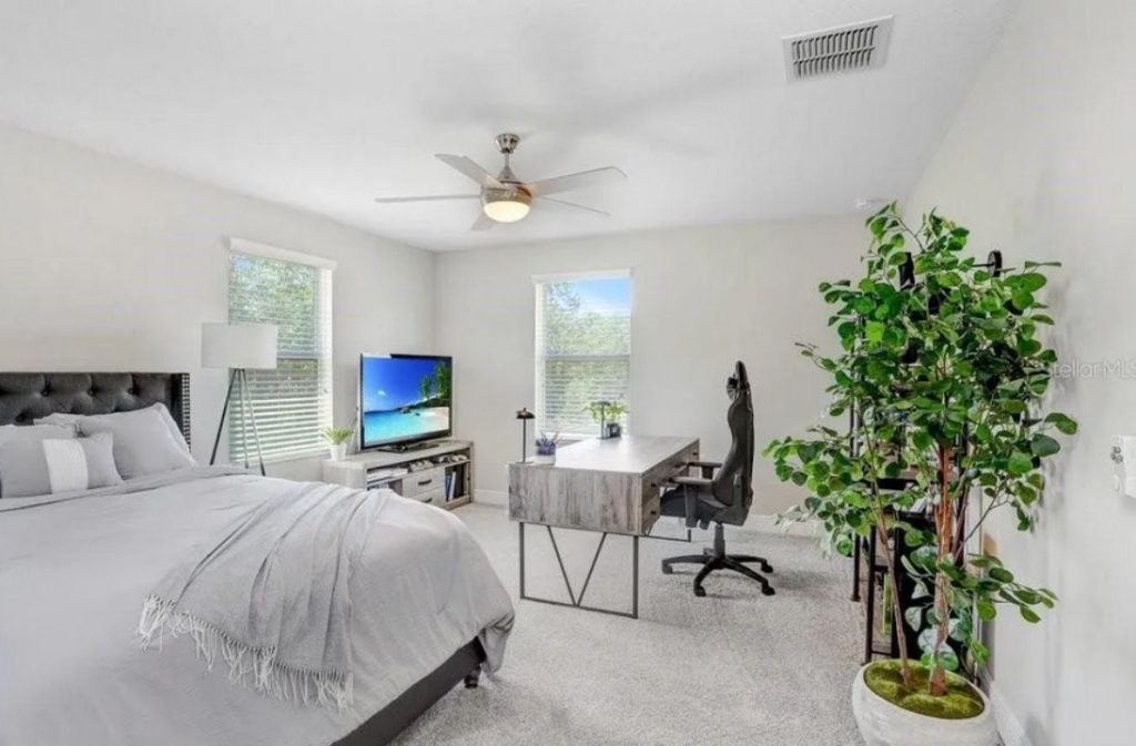 This well-lit bedroom blends comfort with functionality, featuring a relaxing bed setup with soft gray tones and a cozy throw. A workspace is strategically positioned near the windows, complete with a sleek desk and ergonomic chair for a productive environment. The room’s natural light is complemented by a large TV for leisure moments. The stylish decor includes a lush potted plant, bringing a touch of nature indoors. The room’s open, airy feel is enhanced by a fan and minimalistic furnishings.