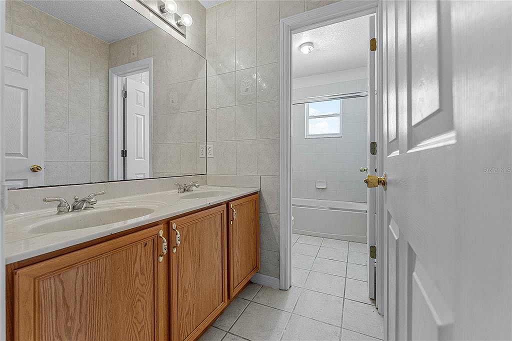 This bathroom features a clean and functional layout with neutral tones throughout. The vanity showcases a double sink set in a smooth, cream countertop complemented by warm, natural wood cabinetry below. A large mirror spans the length of the vanity, enhancing the sense of space and light. Above, three globe-style light fixtures provide ample illumination. The walls and floor are covered in soft beige tiles with subtle patterns, continuing into the adjacent area through an open doorway. Beyond is a separate nook with a bathtub surrounded by white tiles, softened by a small window letting in natural light, emphasizing a fresh and airy atmosphere.