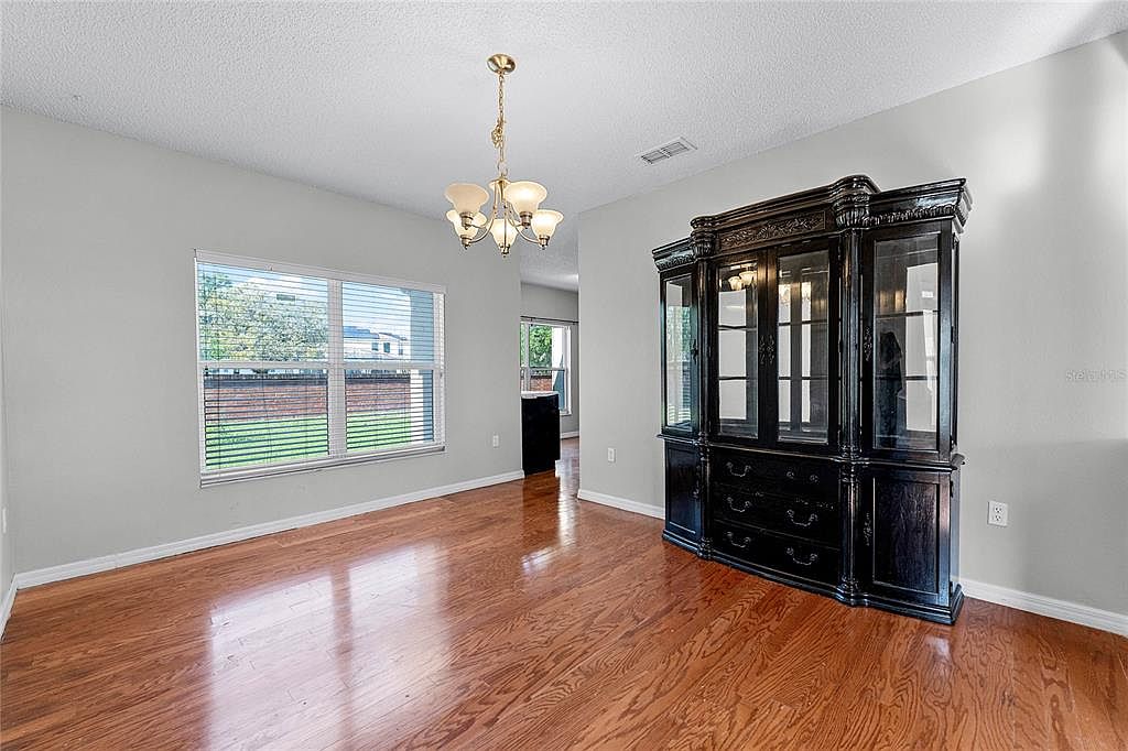This spacious dining room features a warm, polished wood floor that contrasts elegantly with the light gray walls, creating a modern yet inviting atmosphere. A large window floods the room with natural light while offering a view of a well-maintained backyard with a brick fence. The centerpiece chandelier with frosted glass shades hangs gracefully from the white ceiling, adding classic charm. A stately black china cabinet with intricate carvings and glass doors stands against one wall, perfect for displaying treasured dinnerware or collectibles. The open layout leads into an adjacent living or kitchen area, enhancing flow and functionality.
