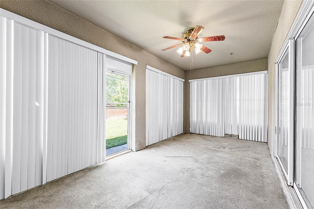 This enclosed patio features a spacious rectangular layout with a concrete floor that adds a raw, industrial touch. Surrounded by large windows and sliding glass doors, the room is fitted with vertical white blinds, allowing controlled natural light and privacy. The walls are painted in a neutral beige tone, complementing the white trim and blinds. A central ceiling fan with five wooden blades and multiple light fixtures provides both illumination and air circulation. The access door opens to a backyard space, making this area ideal for seasonal lounging or indoor-outdoor entertaining with a subtle, minimalist aesthetic.