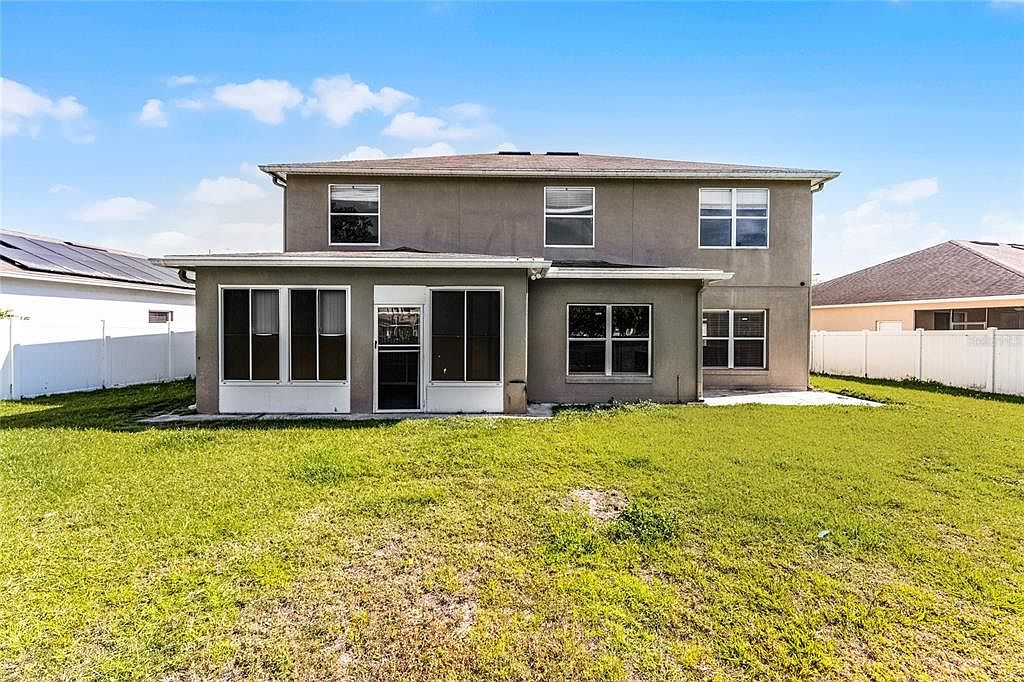 This spacious backyard features a large grassy area bordered by white privacy fencing on both sides, contributing to a secure and welcoming outdoor space. The house’s back facade is characterized by a neutral, muted brownish-gray exterior with a two-story design. Several windows of varying sizes allow ample natural light into the interior rooms, and a covered patio area with screened doors suggests a perfect spot for outdoor seating or dining. The overall aesthetic is simple and practical, blending clean lines with functional outdoor living potential in a suburban setting.