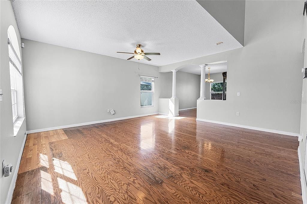 This spacious living area features warm-toned hardwood floors that add natural texture and richness to the space. Soft light gray walls create a calm, neutral backdrop, enhancing the natural light streaming in from multiple windows. The room is open and airy, with a ceiling fan centrally positioned for comfort and air circulation. Architectural details include a partial wall with white round columns that subtly separate the living room from the adjoining dining area. Crown molding and baseboards add subtle polish. The generous open floor plan offers versatile furnishing possibilities for a comfortable, inviting living environment.