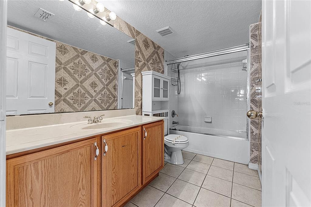 This bathroom features a spacious vanity with a light beige countertop and an under-mounted sink, paired with a wooden cabinet base in a natural oak finish, offering ample storage. The wall behind the vanity is adorned with decorative tile in a muted brown and beige pattern, adding texture and visual interest. A large mirror spans the length of the vanity, complemented by a strip of globe lights above, ensuring bright illumination. The floor is tiled in a neutral square pattern that matches the overall earthy tones. A white bathtub with a tiled surround and a glass sliding door is positioned against the far wall alongside a white toilet. A slim white storage cabinet with glass doors provides additional organization space, enhancing the room’s functionality while maintaining a clean, classic aesthetic.