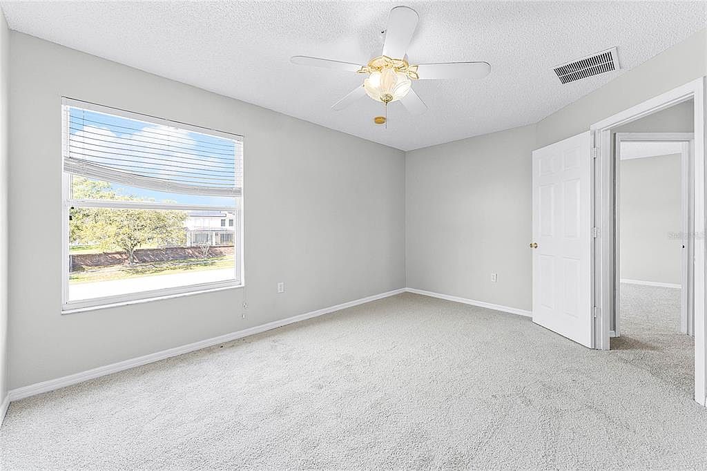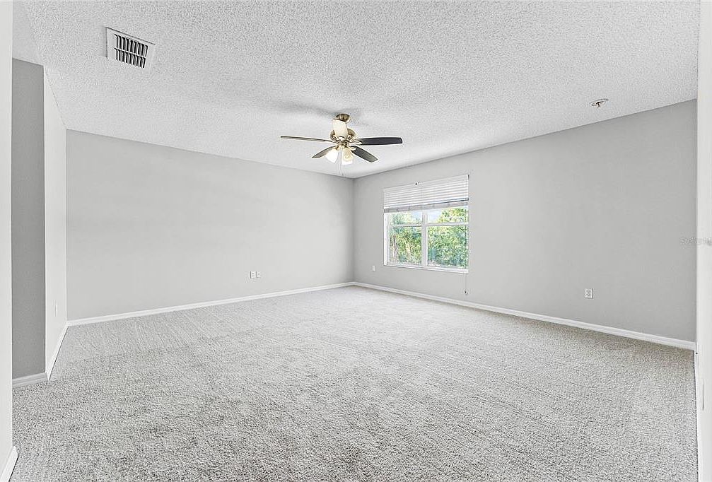 This bedroom features a generous floor space covered in soft, light gray carpet that complements the calming pale gray walls. A large window on one wall allows natural light to illuminate the room while providing views of greenery outside, enhancing a serene atmosphere. The ceiling is finished with a textured popcorn style and hosts a central ceiling fan with light fixtures, combining function and subtle design. White baseboards offer a crisp contrast around the perimeter, and the overall layout promotes flexibility for various furniture arrangements in a peaceful, neutral setting.