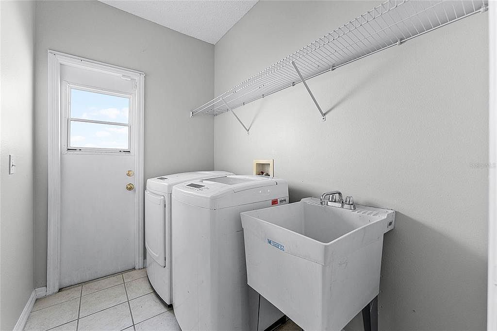 This laundry room is designed in a simple, functional style with a clean and airy atmosphere. The space features a side-by-side white washer and dryer set positioned against a pale gray wall. Adjacent to these appliances is a large, deep utility sink with a basic faucet, suitable for hand washing or pre-soaking laundry. Above runs a long, white wire shelf providing ample storage for laundry essentials. The room is illuminated by natural light streaming through a half-glass door, which opens to the exterior, enhancing the fresh and practical feel of the space. The tiled floor is light-colored, complementing the neutral walls.