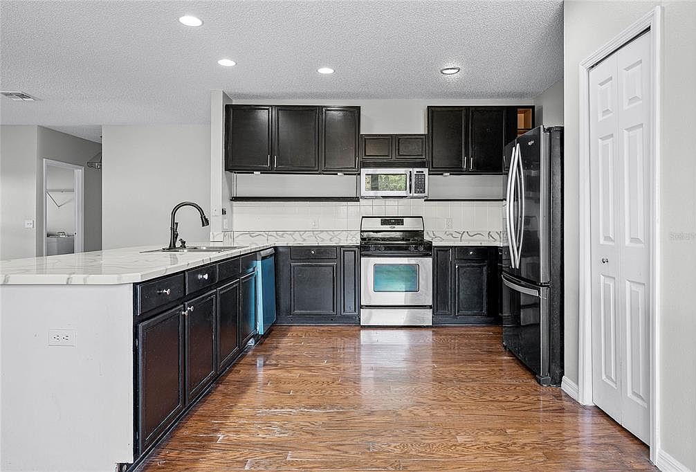 This kitchen features a spacious and functional layout with an L-shaped counter creating ample workspace. Dark cabinetry with a matte finish contrasts elegantly against the light marbled countertops and backsplash, balancing modern and classic styles. Stainless steel appliances, including a gas stove and microwave, meld seamlessly with a sleek black refrigerator, enhancing the contemporary vibe. The flooring showcases warm-toned wood planks that add a cozy, natural element. Recessed ceiling lights provide bright, even illumination throughout the kitchen. A black faucet on the island sink adds a subtle but polished touch to this well-organized culinary space.