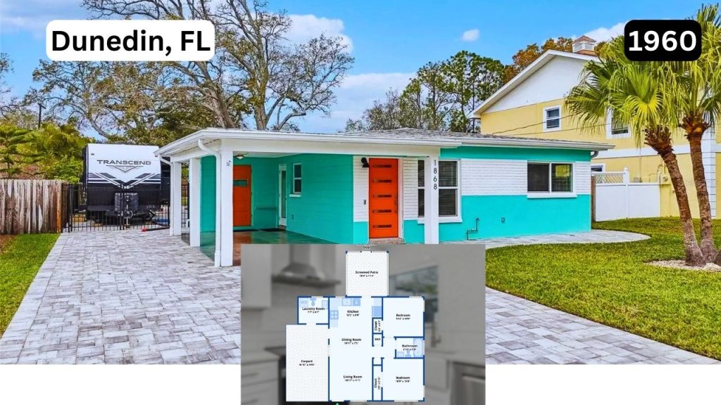 Located in the heart of Dunedin, Florida, this charming mid-century modern bungalow offers 728 square feet of renovated living space on a generous 6,617-square-foot lot. Priced at $529,900, the residence blends classic Florida character with a full suite of modern upgrades. Originally built in 1960, the home now features updated electrical and plumbing systems, a new HVAC unit, and a recently installed fire sprinkler system. With two bedrooms, one and a half bathrooms, and a bright, open layout, this cozy retreat sits directly along the Pinellas Trail and across from Hammock Park. Ideal for those seeking a walkable lifestyle near nature and vibrant downtown attractions, this property offers both comfort and convenience in one of Dunedin’s most desirable neighborhoods.