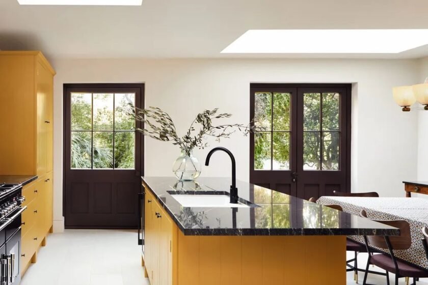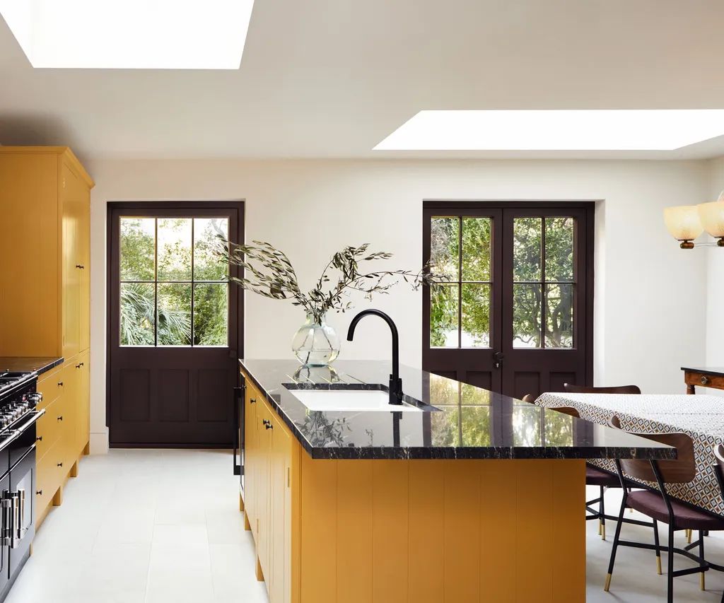 Bright yellow brings a cheerful, uplifting energy to the kitchen, while moody tones like charcoal or navy ground the space with depth and drama. This high-contrast pairing allows you to highlight specific areas, such as an island or cabinetry, while maintaining a cohesive design. Yellow’s vibrancy ensures the room feels lively and energetic, while darker tones keep it sophisticated. This combination works beautifully in kitchens that embrace bold, artistic expressions.