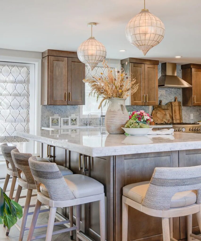 Combining the warmth of rustic wood with the cool tones of ocean blue creates a kitchen that feels both welcoming and refreshing. The natural grain of light wood enhances the organic charm of the space, while blue accents—be it in tiles, furniture, or decor—infuse a sense of calm and coastal serenity. This pairing offers a timeless aesthetic, ideal for blending the coziness of traditional design with a fresh, modern touch inspired by nature.