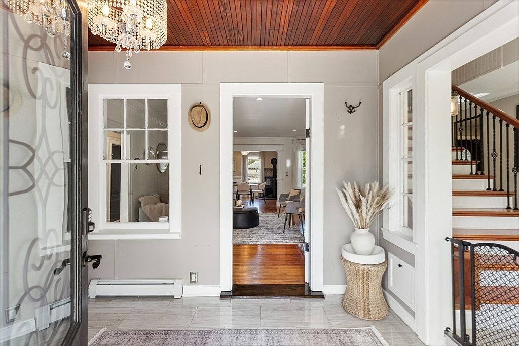 This entryway features a wooden staircase with wrought iron railings, creating an elegant focal point. The walls are painted in a soft gray, complementing the light-colored tiled floor. Natural light floods the space, highlighting a small wooden console table adorned with a vase containing delicate pampas grass. To the left, a gate provides safety and structure, while double doors lead to a stylish room with a patterned floor. Above, a chandelier adds a touch of sophistication. The built-in shelving on the right is tastefully decorated with minimalist decor, enhancing the inviting, modern yet historic charm of the home.