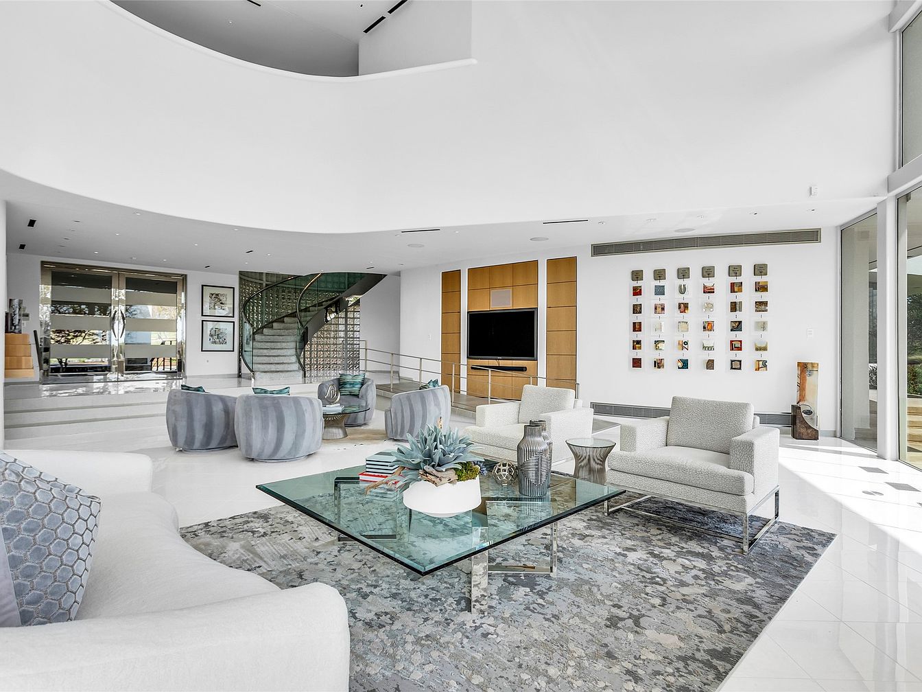 This spacious living room features a modern design with a sweeping curved ceiling and large windows that flood the area with natural light. The open layout encourages family interaction, showcasing a soft color palette of neutrals complemented by blue accents. Comfortable seating includes plush white sofas and stylish, rounded chairs in light gray, arranged around a chic glass coffee table. A textured area rug adds warmth and texture to the shiny tiled floor. Architectural details include a striking spiral staircase and a wood-paneled media unit, creating an inviting space perfect for relaxation and gatherings.