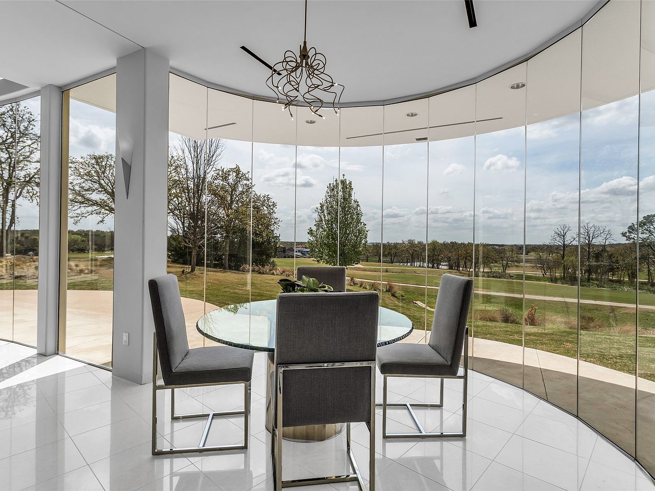 This elegant dining area features a round glass table surrounded by sleek, gray upholstered chairs, offering a contemporary and inviting atmosphere. The space is enveloped by expansive glass walls that showcase breathtaking views of the surrounding landscape, flooding the area with natural light. Clean, white porcelain tiles enhance the modern aesthetic, while the minimalist lighting fixture adds a touch of sophistication. The room’s curved design promotes an open and airy feeling, ideal for family gatherings or intimate meals. This thoughtfully designed area effortlessly blends indoor comfort with the beauty of outdoor vistas, perfect for family moments.