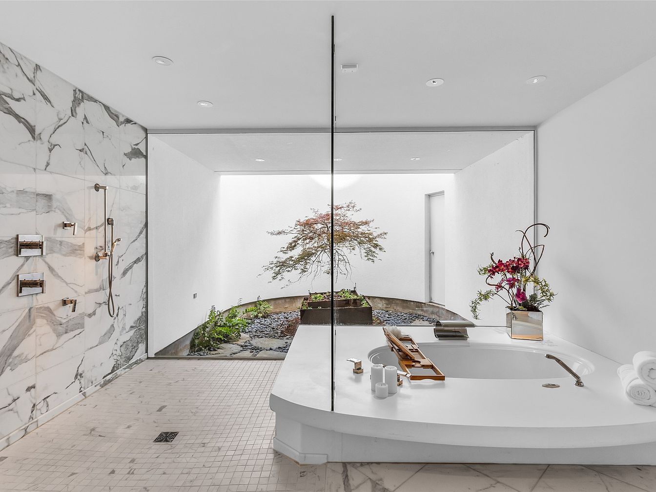This luxurious bathroom features a sleek, white aesthetic, highlighted by elegant marble walls and a spacious, modern soaking tub. Natural light spills through a glass partition that opens to a serene outdoor garden, enhancing the tranquility of the space. The open layout invites effortless movement, while polished fixtures and a stylish shower area promote a sense of luxury. A touch of greenery from the adjoining garden brings the outside in, creating a refreshing atmosphere. Soft towels neatly arranged beside the tub and carefully placed flowers add warmth, making this a perfect family-friendly retreat for relaxation.