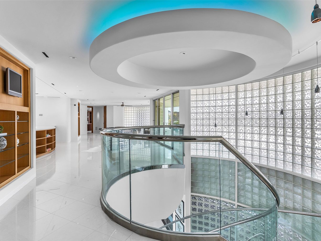 This spacious entryway showcases a modern aesthetic with its sleek white walls and glossy tile flooring, creating an inviting atmosphere. The curved glass railing, a blend of safety and style, elegantly outlines the staircase and provides a clear view of the surroundings. Natural light floods in through large windows, highlighting the unique glass block design, which offers privacy while maintaining brightness. Thoughtfully placed recessed lighting complements the soft blue hue from the ceiling, adding a touch of warmth. The built-in wooden shelves provide practical storage and display options, making it a family-friendly space perfect for welcoming guests.