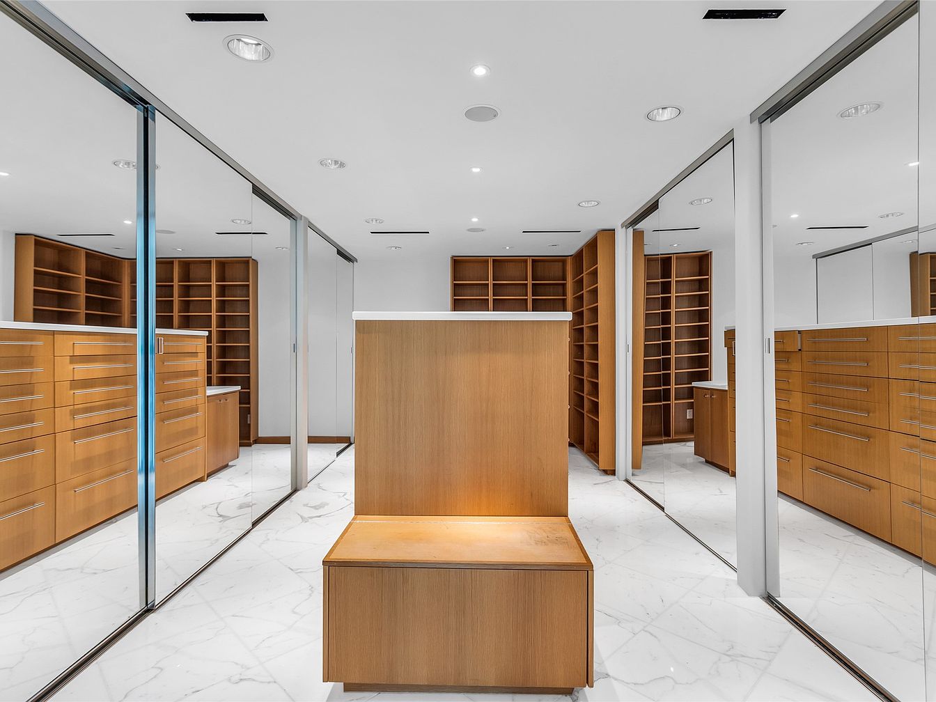 The spacious walk-in closet features sleek wooden cabinetry with ample storage for clothing and accessories. A central seating area is designed for convenience, adding a practical touch to the layout. Mirrored walls enhance the sense of space, reflecting both light and style, while recessed lighting creates a bright and inviting atmosphere. The floor is adorned with elegant marble tiles, complementing the wooden elements perfectly. This family-friendly closet not only caters to organization but also serves as a functional dressing area, making it an ideal space for shared family use.