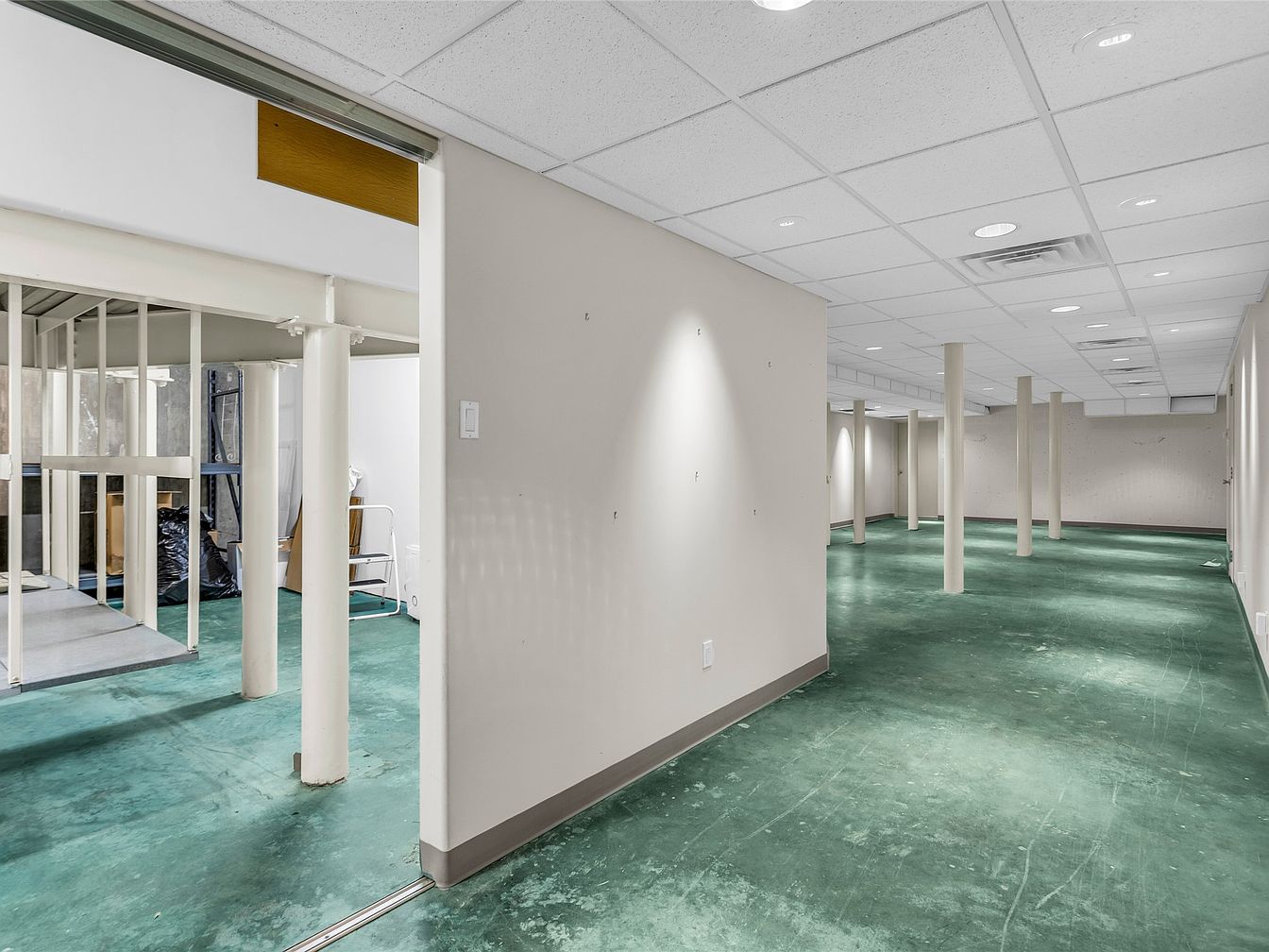 This spacious basement area features a practical layout with ample room for family activities. The floor is a unique green that adds character, while the beige walls create a warm, inviting environment. Vertical pillars provide structural integrity and opportunities for creative design arrangements. The ceiling is finished with bright, recessed lighting, ensuring the area feels open and well-lit. There are multiple potential uses for this space, whether as a playroom, family gathering area, or a home office. The overall design offers versatility, creating an ideal foundation for personalization to suit family needs.