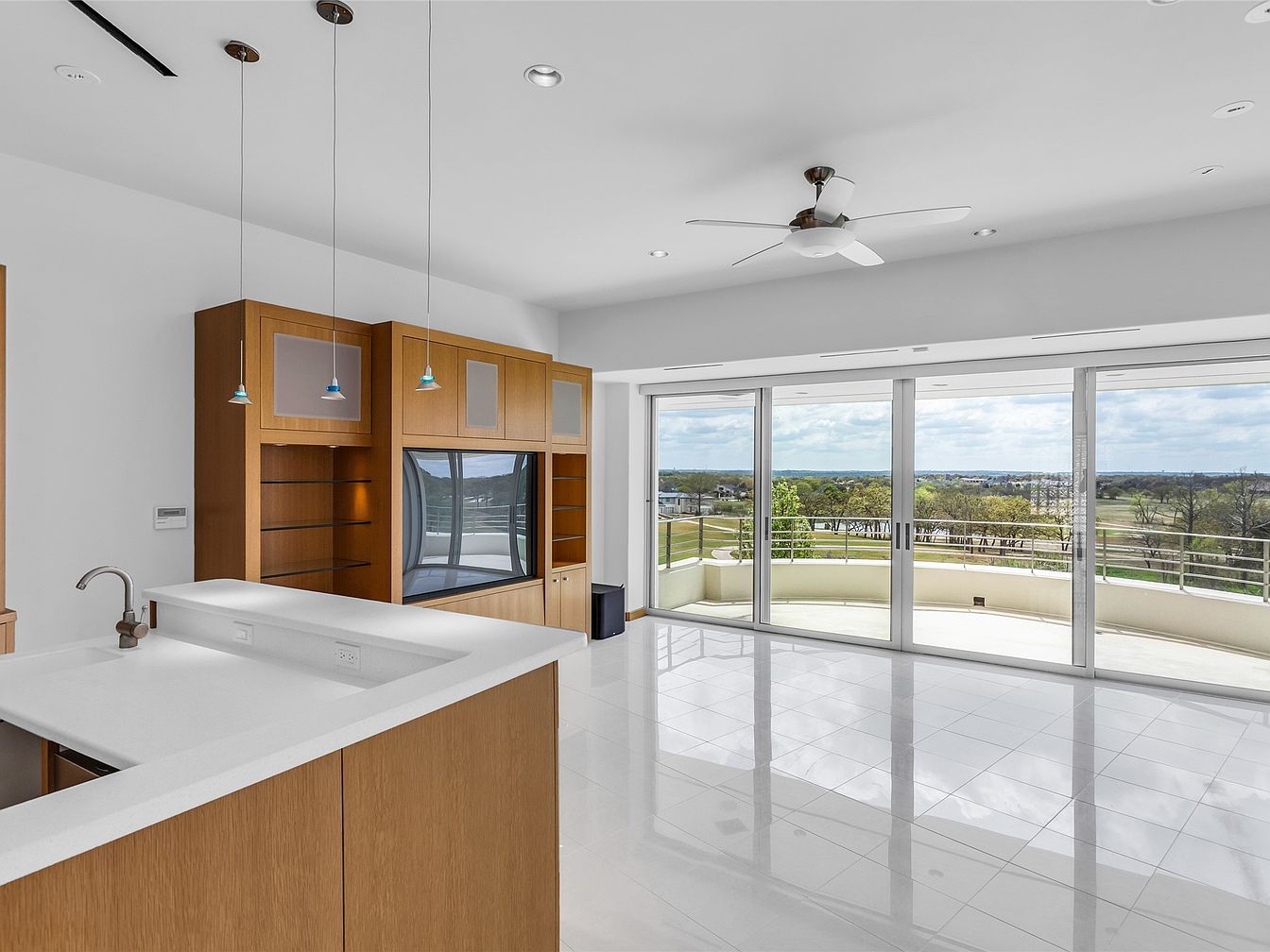 This spacious living area seamlessly connects to an outdoor balcony through expansive sliding glass doors, inviting natural light and offering picturesque views. A sleek white countertop extends from the kitchen, complemented by warm wooden cabinetry that adds warmth and elegance. Stylish hanging pendant lights in soft blue hues provide ambiance, enhancing the modern aesthetic. The polished tile flooring reflects the natural light, creating an airy feel throughout the space. Features such as a ceiling fan ensure comfort, making this area ideal for family gatherings. This design balances functionality and contemporary style for a welcoming atmosphere.