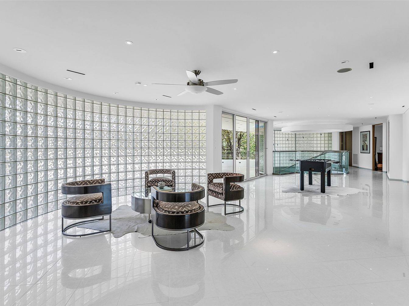 This spacious living room features a contemporary design, highlighted by a stunning curved glass block wall that allows for abundant natural light. The glossy white tiles create an open, airy feel, while stylish lounge chairs with patterned upholstery offer comfort. A sleek circular table sits at the center, enhancing the modern aesthetic. A carefully curated cowhide rug adds texture to the space, blending seamlessly with the minimalist decor. Large glass doors provide access to the outdoor area, promoting family interaction and effortless entertaining. Overall, this inviting space is perfect for gatherings and relaxation.