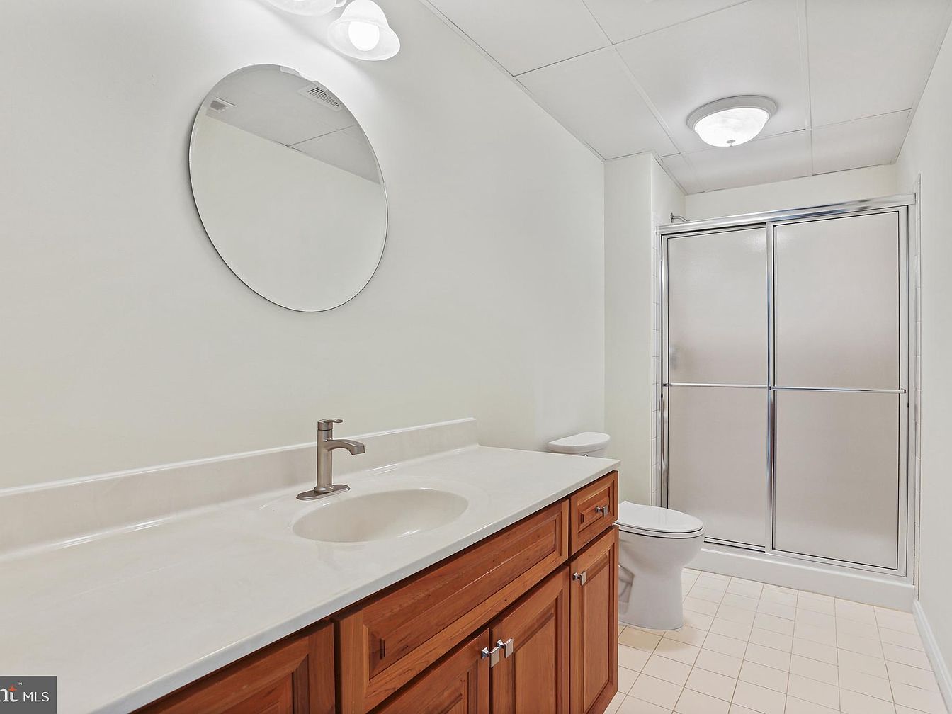 This bathroom features a clean, minimalist layout with a prevalent neutral color palette of whites and light beiges. The vanity cabinetry is crafted from warm-toned wood, adding a natural contrast to the otherwise bright and sterile environment. A smooth, glossy countertop hosts a single undermount sink with a modern brushed nickel faucet. Above the sink, a large round mirror with a simple design complements a delicate wall-mounted sconce light. Opposite the vanity, a white toilet sits next to a walk-in shower enclosed by frosted sliding glass doors with shiny chrome trim. The flooring consists of pale, square tiles that enhance the sense of spaciousness and hygiene in the room.