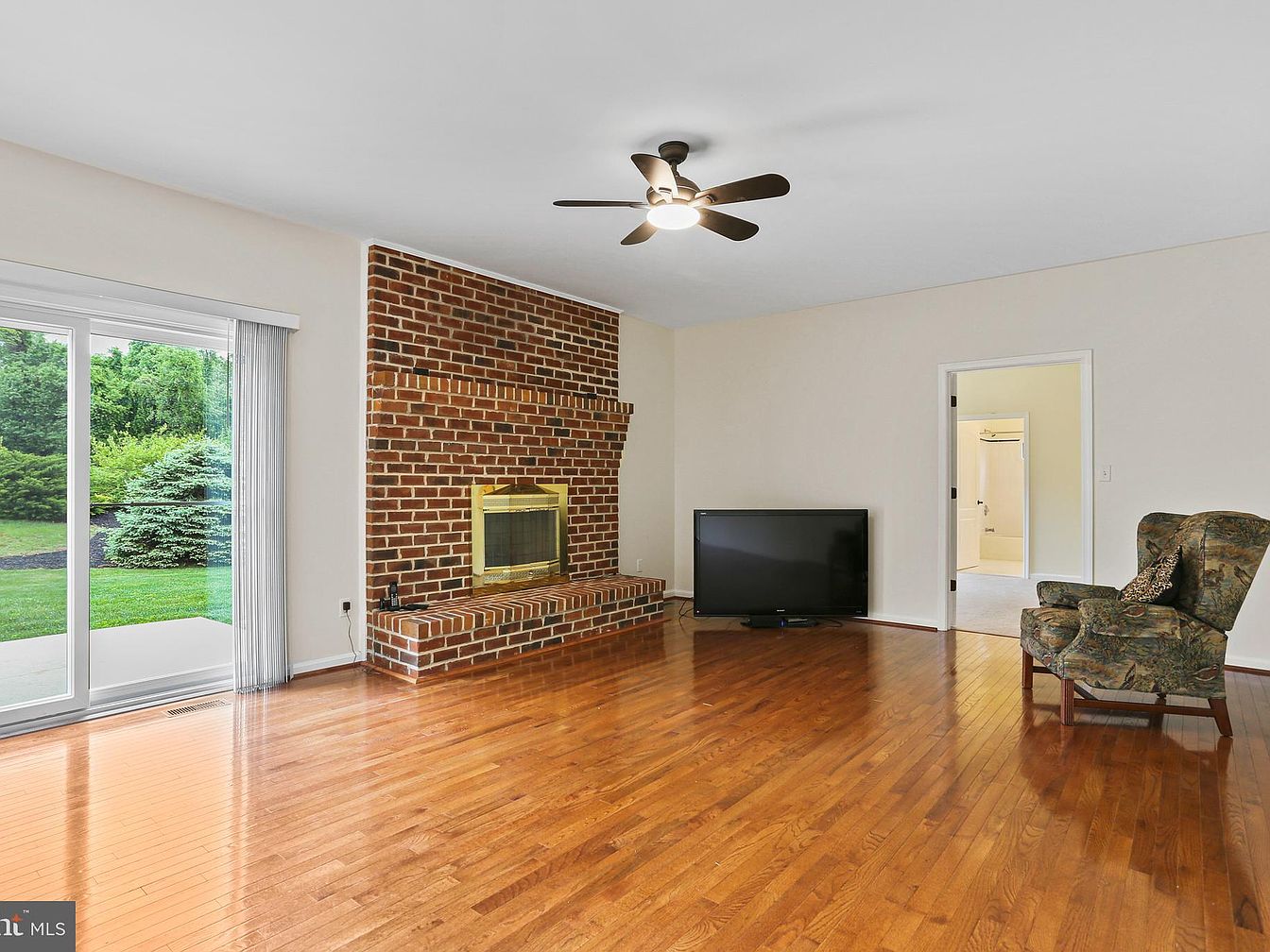 This spacious living room highlights a classic warmth with its rich, honey-toned hardwood floors that extend throughout the area. A prominent brick fireplace with a brass screen serves as a focal point, bringing rustic charm and textured contrast to the neutral beige walls. The sliding glass door allows abundant natural light and offers a seamless connection to the verdant outdoor space. The ceiling fan with dark blades complements the room’s mix of vintage and modern elements. Furnished with a patterned wingback chair and a large flat-screen TV casually placed on the floor, the room has a cozy, lived-in feel that invites relaxation.