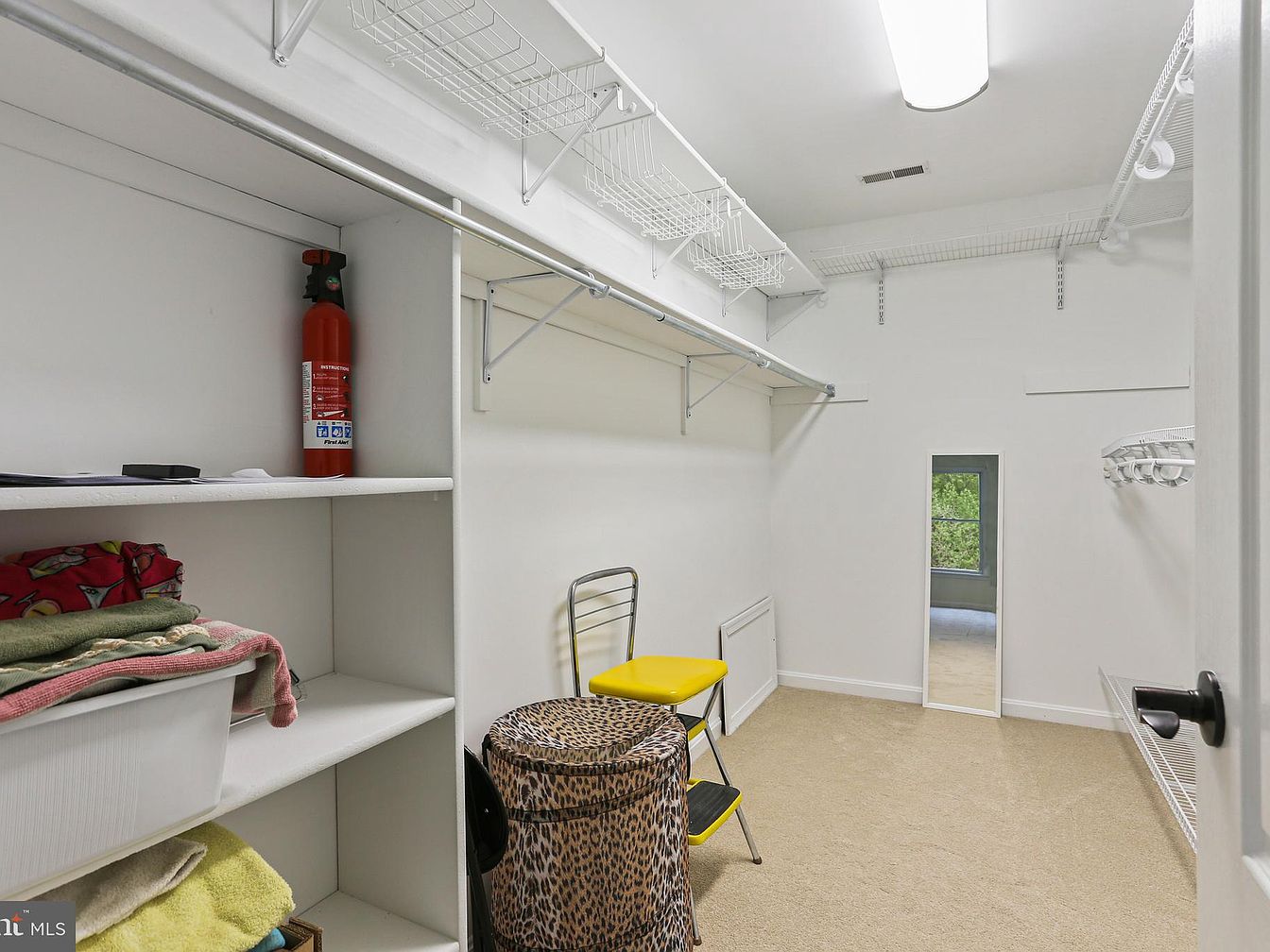 This spacious walk-in closet features an efficient organizational layout with white wire shelving running along the perimeter walls for hanging clothes and storing items above. The walls and ceiling are painted crisp white, enhancing the brightness provided by the overhead fluorescent light fixture. On one wall, built-in shelving units offer additional space for folded garments and accessories. A full-length mirror leaning against the far wall creates a practical dressing area. The floor is carpeted in a soft, neutral beige tone. A leopard-print hamper, yellow-cushioned step ladder chair, and red fire extinguisher add subtle spots of color and practicality in the uncluttered, functional space.
