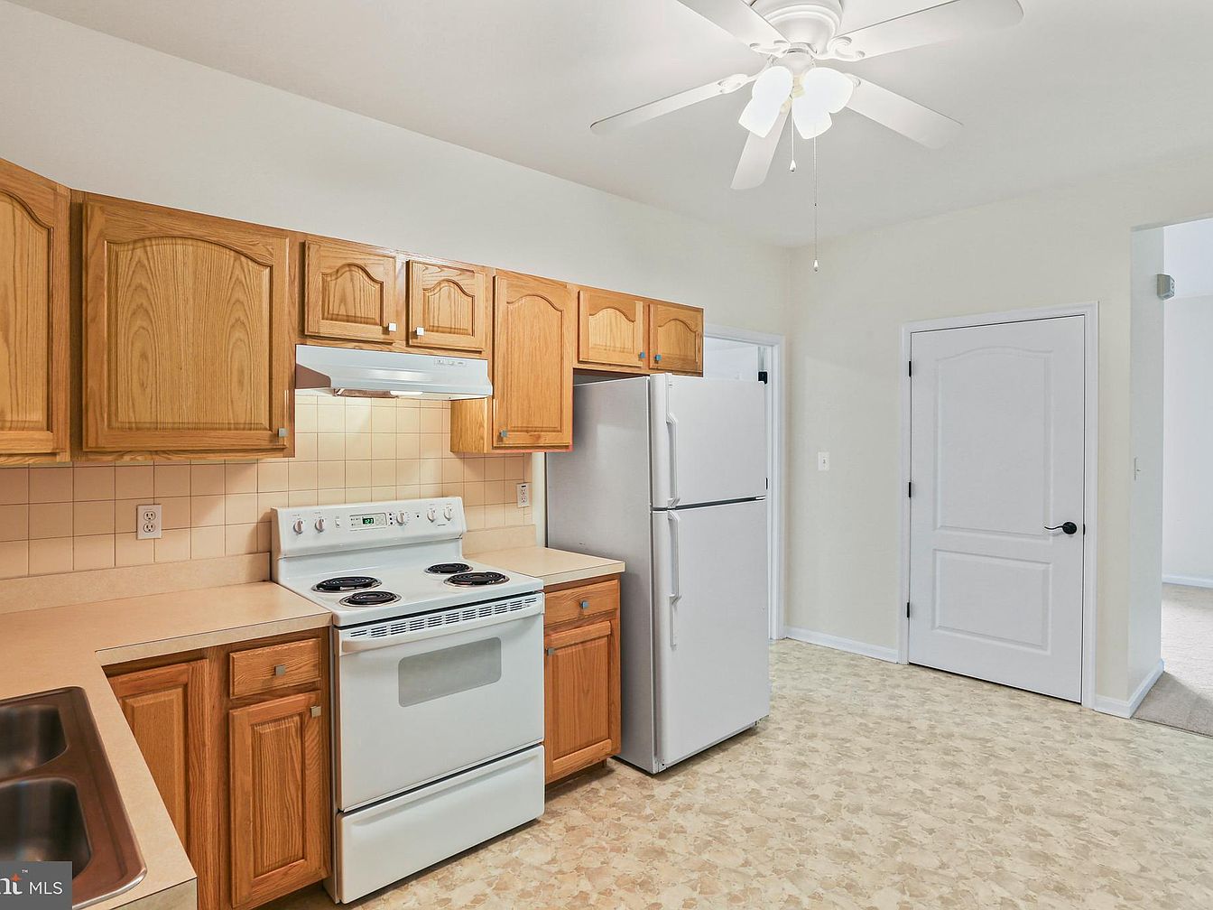 This kitchen features a practical, straightforward layout with an L-shaped counter anchoring the space. Warm oak cabinetry with classic raised panel doors lines the upper and lower sections, complementing beige laminate countertops and a soft neutral tile backsplash. Appliances include a white electric stove and a refrigerator that blend seamlessly with the light color palette. The pale vinyl flooring echoes the muted tones, enhancing the room’s brightness alongside white walls and ceiling. A white ceiling fan with a built-in light fixture hangs centrally, adding function and understated style while maintaining a clean, cozy atmosphere.