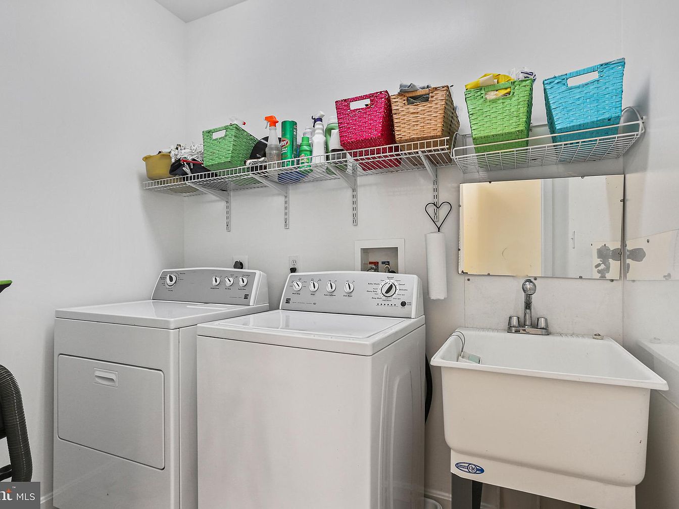 This practical laundry room features a clean, bright design with white walls and matching white appliances, including a top-loading washing machine and a front-loading dryer. Above the machines, a wire shelf spans the width of the room, neatly organized with colorful woven baskets in red, green, blue, and tan, holding laundry essentials and cleaning products. A deep utility sink with chrome fixtures stands adjacent to the machines, offering convenience for hand-washing or pre-treating stains. The overall aesthetic is simple and functional, emphasizing organized storage and ease of use in a compact, well-lit space.