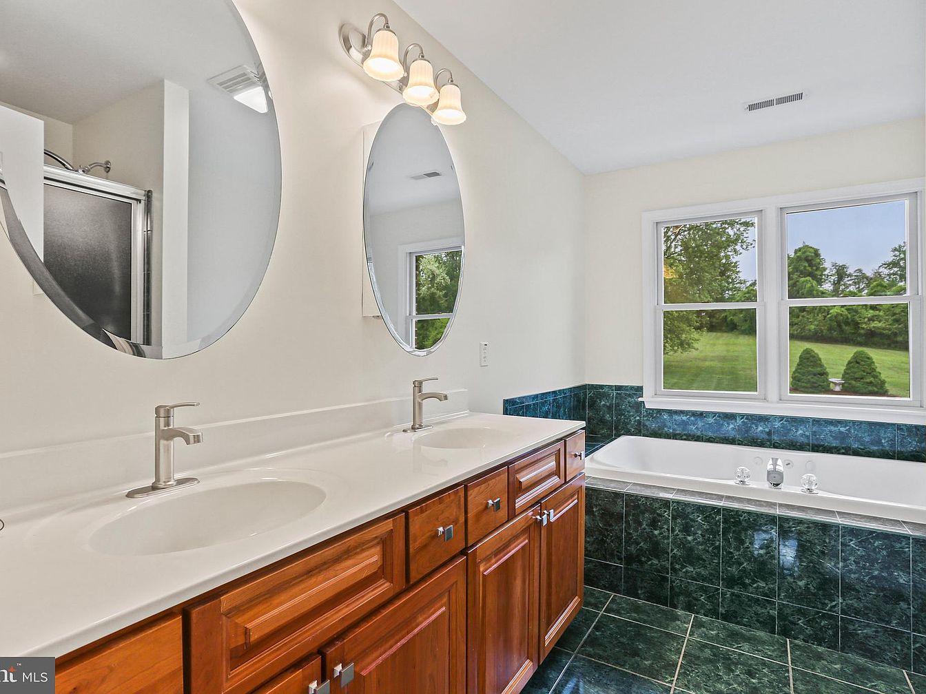 This bathroom features a spacious wooden vanity with rich, warm-toned cabinetry and a smooth, white countertop housing dual sinks. Above each sink, oval mirrors are mounted, complemented by a three-light fixture with frosted glass shades, adding soft illumination. Adjacent to the vanity is a deep soaking tub surrounded by glossy emerald green marble tiles that extend onto the floor, creating a cohesive luxury look. Natural light floods the room through a large window with a pleasant view of a green lawn and trees, enhancing the serene and inviting atmosphere.