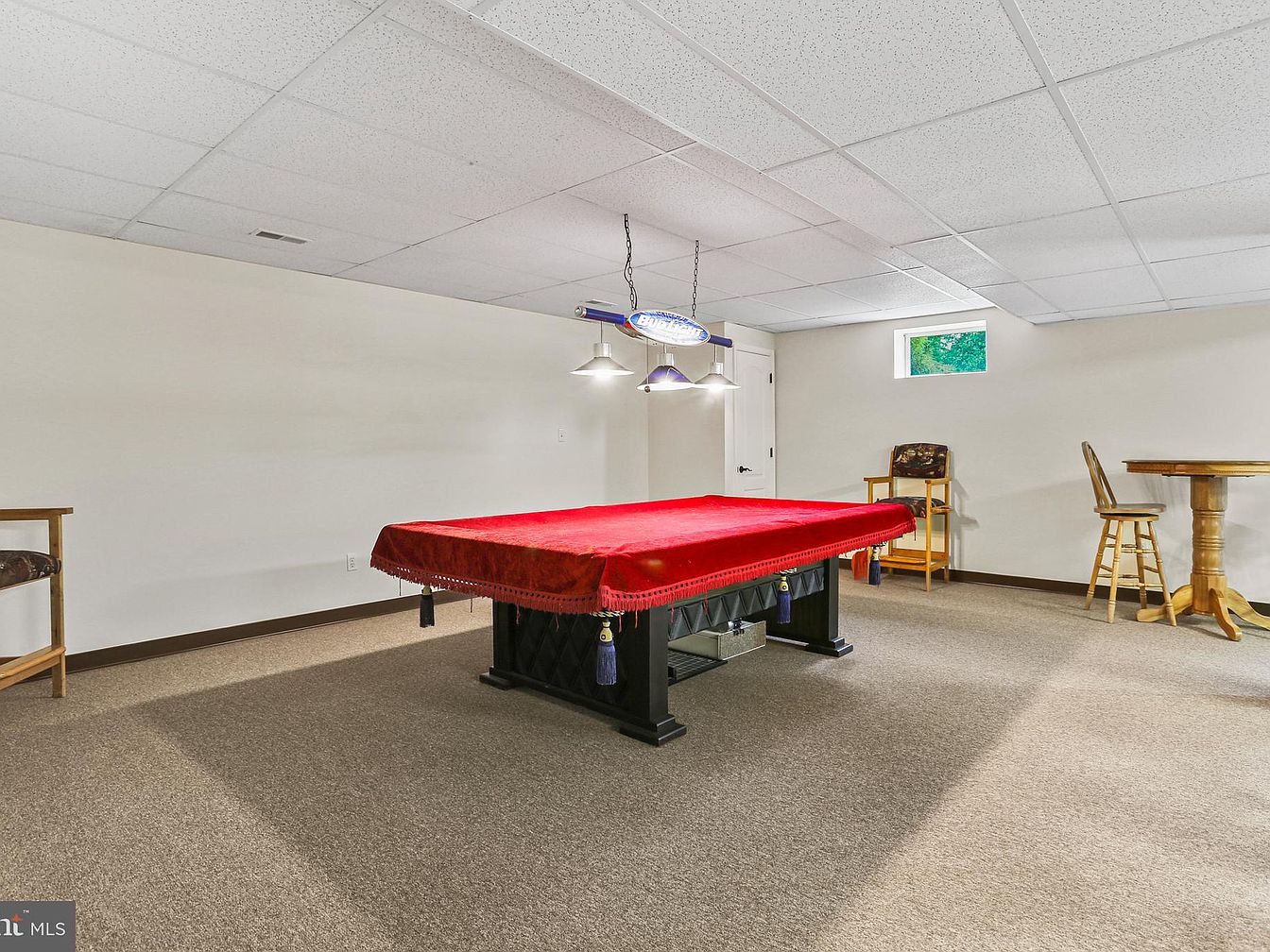 This spacious basement game room centers around a prominent pool table with a vivid red felt cover that draws the eye immediately. The neutral beige carpeting complements the off-white painted walls, creating a calm backdrop for the lively centerpiece. A trio of chain-suspended pendant lights hangs directly above the pool table, providing focused illumination for gameplay. Furnished with wooden, upholstered armchairs and a simple round wooden table paired with a matching bar stool, this space balances recreation and casual seating. A small window admits natural light, softening the overall ambiance beneath the dropped ceiling with grid panels.