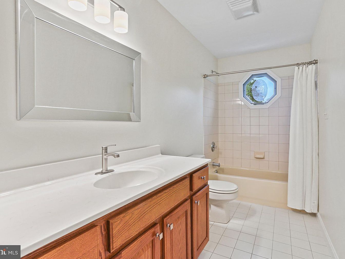This bathroom features a clean, functional layout with a single vanity topped by a smooth, white countertop and an undermount sink. The cabinetry below is crafted from warm-toned wood, adding a natural contrast to the otherwise neutral palette. Above the sink, a large rectangular mirror framed in silver complements the sleek three-light fixture, providing ample illumination. The bathtub and surrounding walls are tiled in soft beige tones, harmonizing with the pale tile flooring. An octagonal window with frosted details lets in natural light while maintaining privacy, elevating the simple, timeless design.