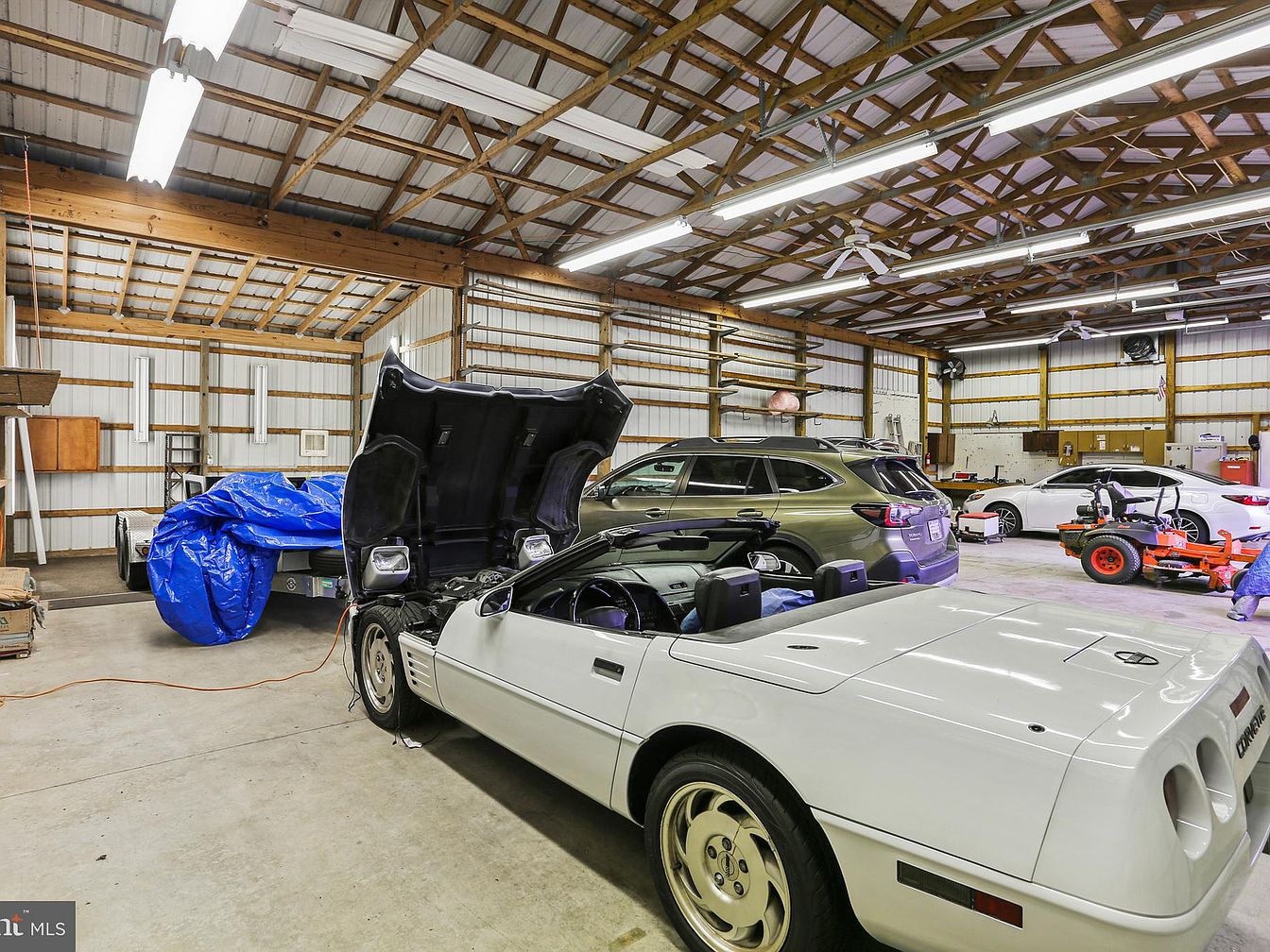 This spacious garage features a high, exposed wooden beam ceiling with metal roofing, creating an industrial yet warm atmosphere. The floor is polished concrete, providing durability and easy maintenance. Several vehicles are parked inside, including a white convertible with its hood open, a metallic green SUV, and a white sedan, showcasing ample parking space. The back wall is lined with wooden shelves and storage cabinets, while fluorescent lighting ensures bright, even illumination. The layout maximizes functionality, making it ideal for both vehicle storage and mechanical work, complemented by an organized yet utilitarian aesthetic.
